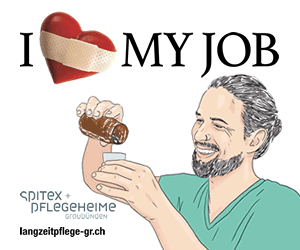 Die von Spitex und Pflegeheime Graubünden lancierte Imagekampagne «I love my Job» geht in die nächste Runde. Ab Mitte Mai weist ein neues Sujet auf die Bedeutung der Langzeitpflege hin. Es zeigt einen Mann beim Richten von Medikamenten und transportiert folgende Botschaften: